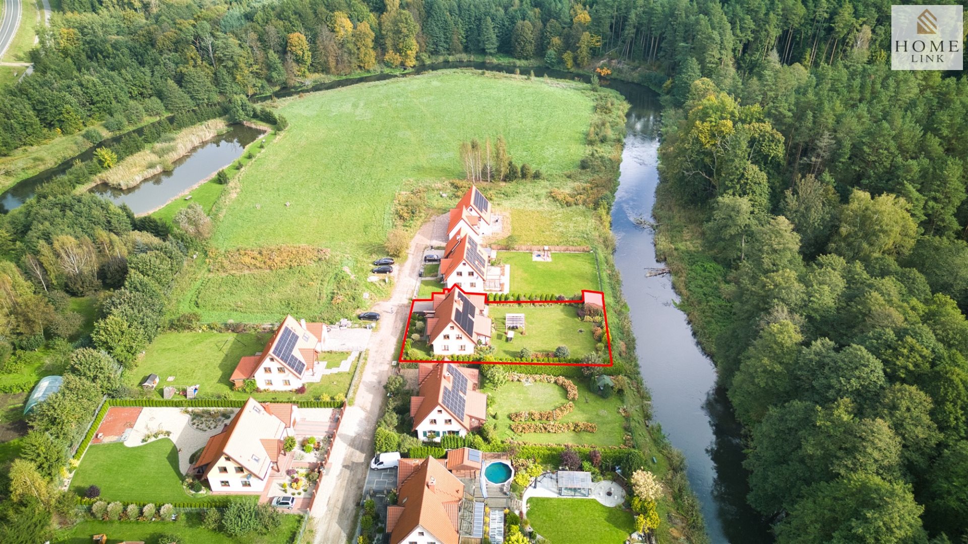 Dojazd do nieruchomości realizowany jest wewnętrzna drogą, samo osiedle jest już praktycznie skończone, poza jedną działka znajdująca się naprzeciwko nieruchomości. Oznacza to tylko tyle – że nie powstanie więcej domów. Co więcej, osiedle leży w granicach obszaru ochrony krajobrazu Doliny Dolnej Łyny, a na przeciw (za rzeką) znajdują się liczne połacie Lasów Państwowych co oznacza, że od strony południowej nie powstanie już żadne inne zabudowanie.