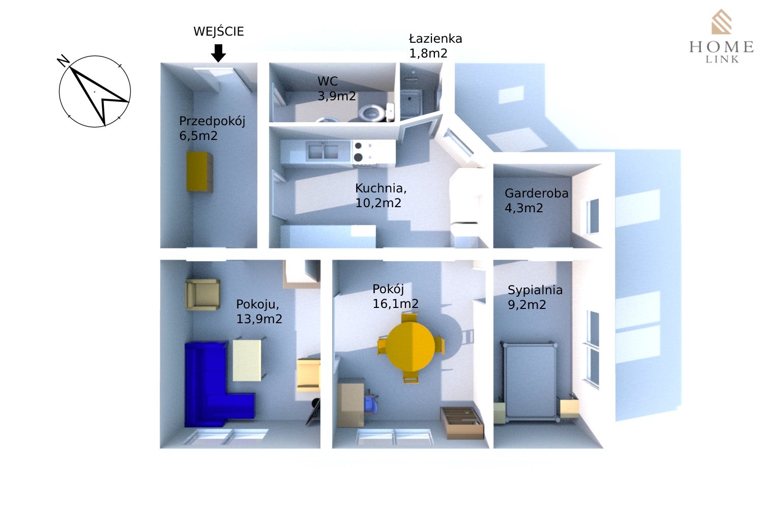 Rozkład pomieszczeń przedstawiłem dla Ciebie na rzucie 3D.